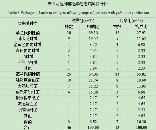 对照组肺部感染患者31例标本中共分析出病原菌46株,其中革兰氏阴性菌25株,占54.35%,最主要的病原菌为肺炎克雷伯菌和大肠埃希菌,分别分析出10株(21.74%)和7株(15.22%);革兰氏阳性菌分析出18株,占39.13%,其中肺炎链球菌分析出9株(19.57%);观察组肺部感染患者25例标本中共分析出病原菌43株,其中革兰氏阴性菌24株,占55.81%,最主要的病原菌为肺炎克雷伯菌和大肠埃希菌,分别分析出8株(18.60%)和6株(13.95%);革兰氏阳性菌分析出12株,占27.91%,其中肺炎链球菌分析出5株(11.63%)。观察组病原菌分析中真菌检测到7株(16.28%),高于对照组真菌检出率(6.52%),但两组间差异不存在统计学意义(c2=2.122,P=0.145)见表3。