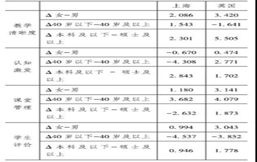 在课堂管理上,上海具备硕士及以上学历的初中数学教师表现出了更为突出的行为(Δ=-2.632),而这方面的优势在英国恰恰在具备本科及以下学历的教师那里(Δ=1.873)。在学生评价方面,两地的优势组别较为统一,即女性、40岁及以上、本科及以下学历的教师对于学生开展学习评价的表现更多也更好。此外,就不同性别的教师而言,在几乎所有的课堂教学行为上,女性教师在沪英两地都有更高的得分,且这种优势在英国教师中更为显著。